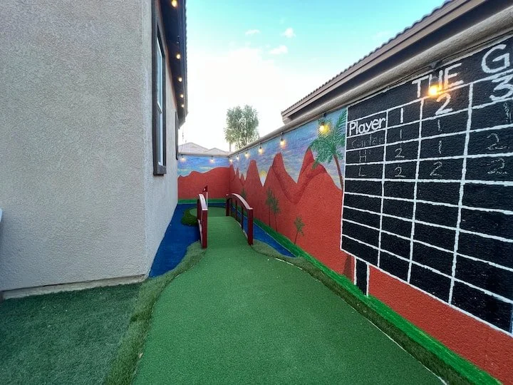 The Greens features a custom-designed 5-hole mini golf course complete with water and sand trap obstacles, string lighting for night play, and a challenging 5th hole that takes you over a small bridge. Guests of all ages can enjoy friendly competition using the provided right- and left-handed putters, standard golf balls, or fun light-up balls for evening rounds. A chalk scoreboard is mounted on the wall so you can keep track of scores and tournament bragging rights. Whether you're playing under the sun or stars, this mini golf course brings an extra level of fun and flair to your stay.
