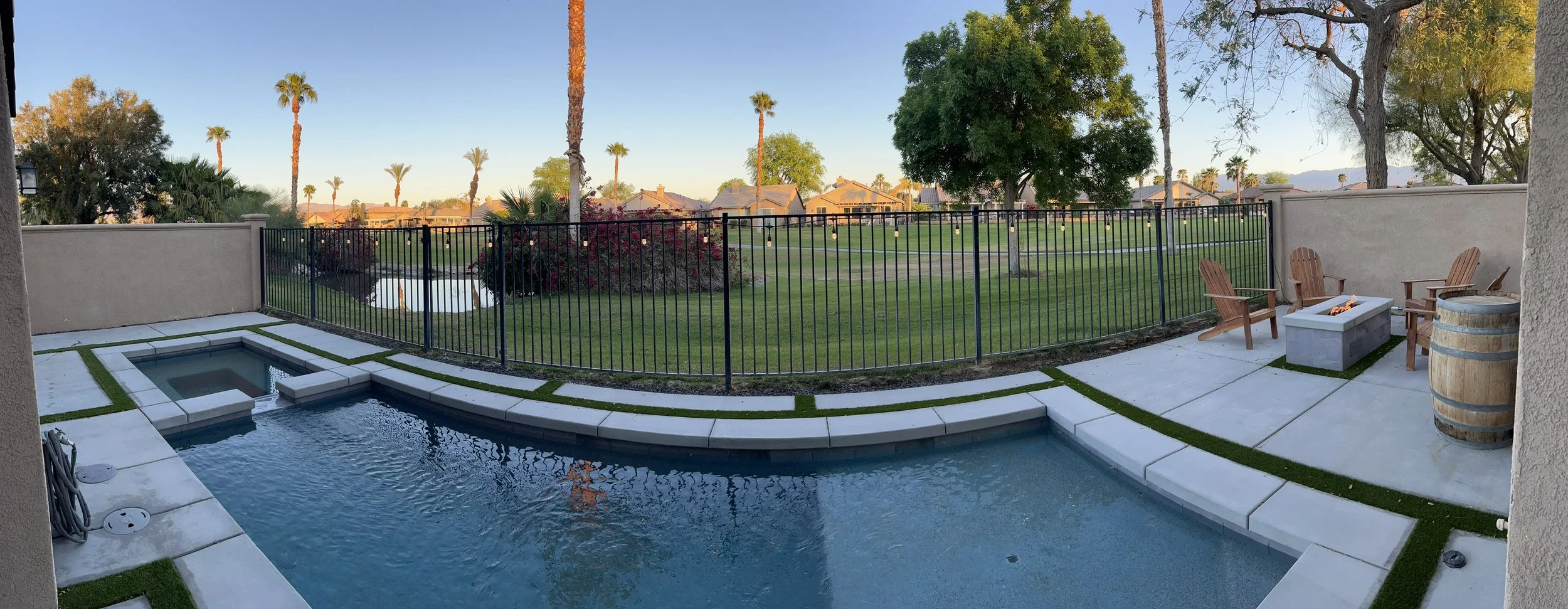 The pool overlooks a beautiful pond on the golf course and sits right near the tee box of hole #4 at Indian Palms CC. You also get stunning mountain views, especially at sunset.