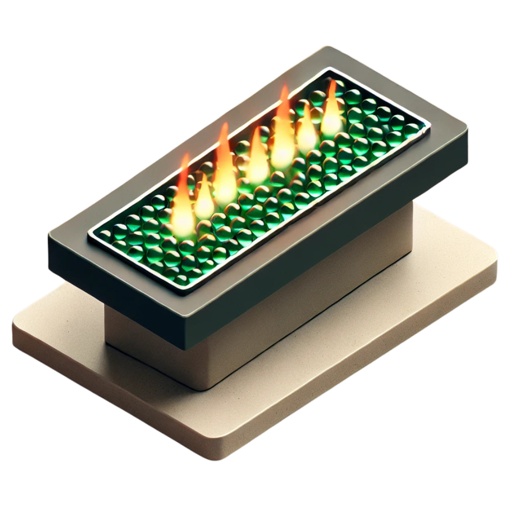 It’s a built in gas-powered firepit with green glass beads for a modern, stylish look.