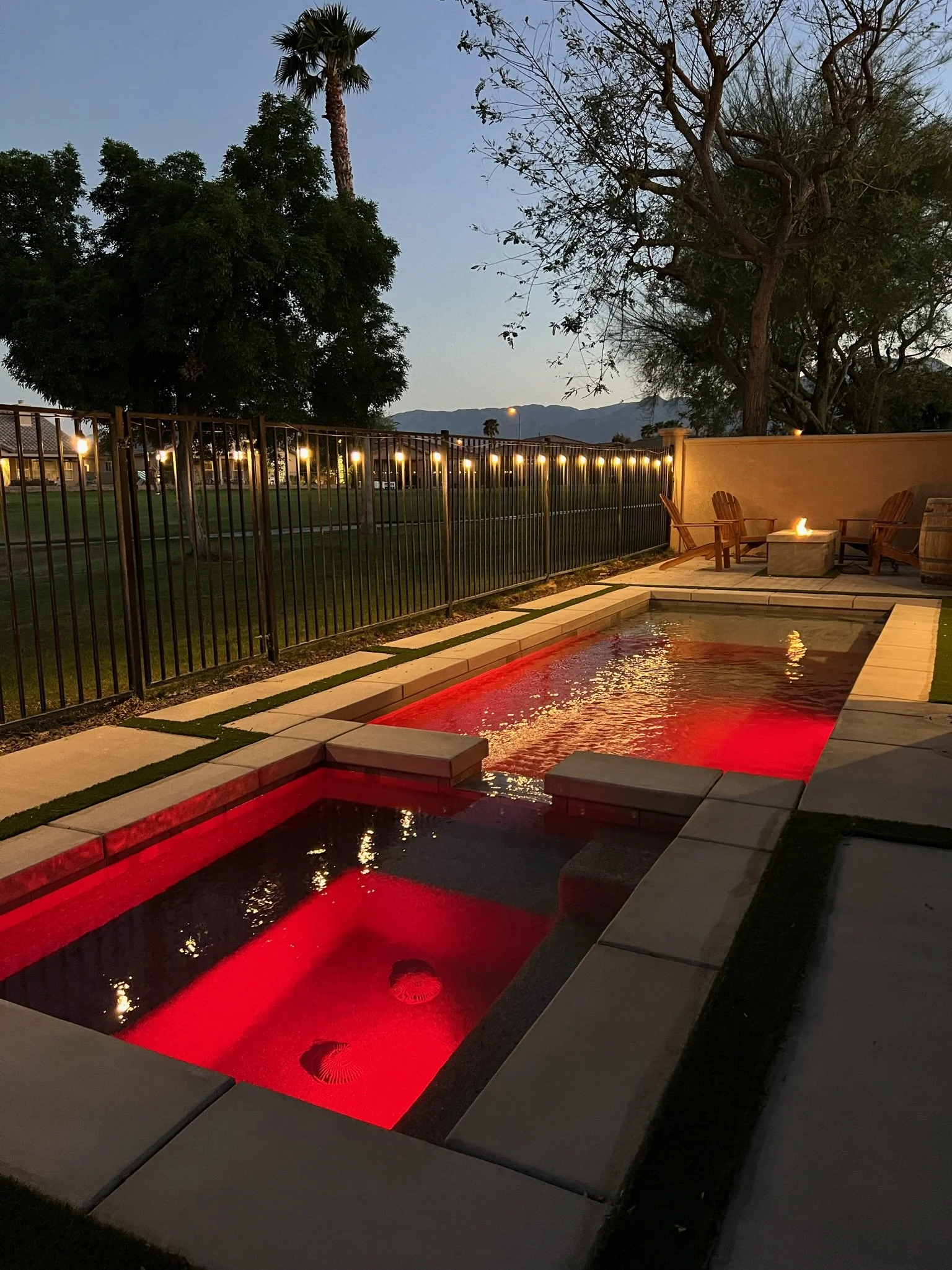 The private saltwater pool at The Greens offers a serene and picturesque escape, perfectly designed for relaxation and fun. Measuring 8 feet wide by 15 feet long, the pool features a 6-foot tanning shelf with built-in steps for easy entry, an umbrella slot for shade, and pool loungers for ultimate comfort. As you unwind in the crystal-clear water, enjoy breathtaking views of the pond on the golf course, overlooking the tee box of hole #4 at Indian Palms Country Club, with the majestic mountains serving as a stunning backdrop. Whether you're floating under the sun, enjoying a sunset swim with color-changing RGB lights, or taking in the peaceful ambiance of the golf course and desert landscape, this heated saltwater pool is the perfect place to relax, refresh, and soak in the beauty of Coachella Valley. Plus, for added fun, we provide a variety of pool toys and floaties, making it easy to drift, play, or lounge in style while making the most of your poolside experience.
